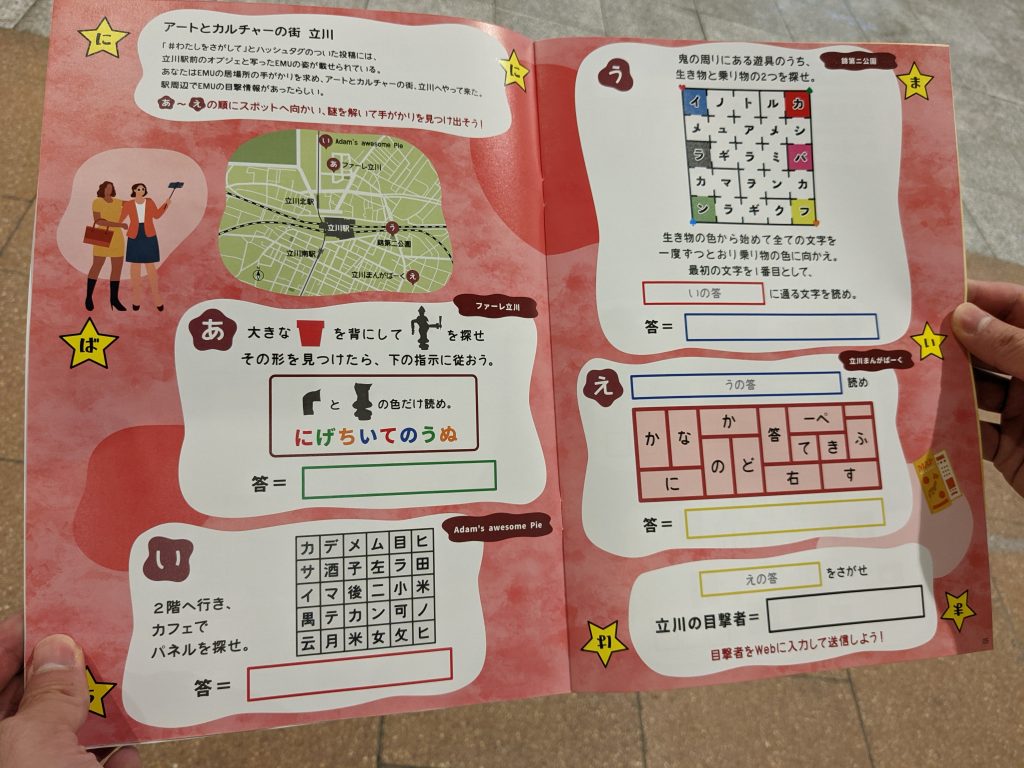 冊子を開くと難しそうな謎が、、、。指定された場所をめぐることで謎が解ける仕様なので早速、向かってみます!まずはアートとカルチャーの街 立川へ!