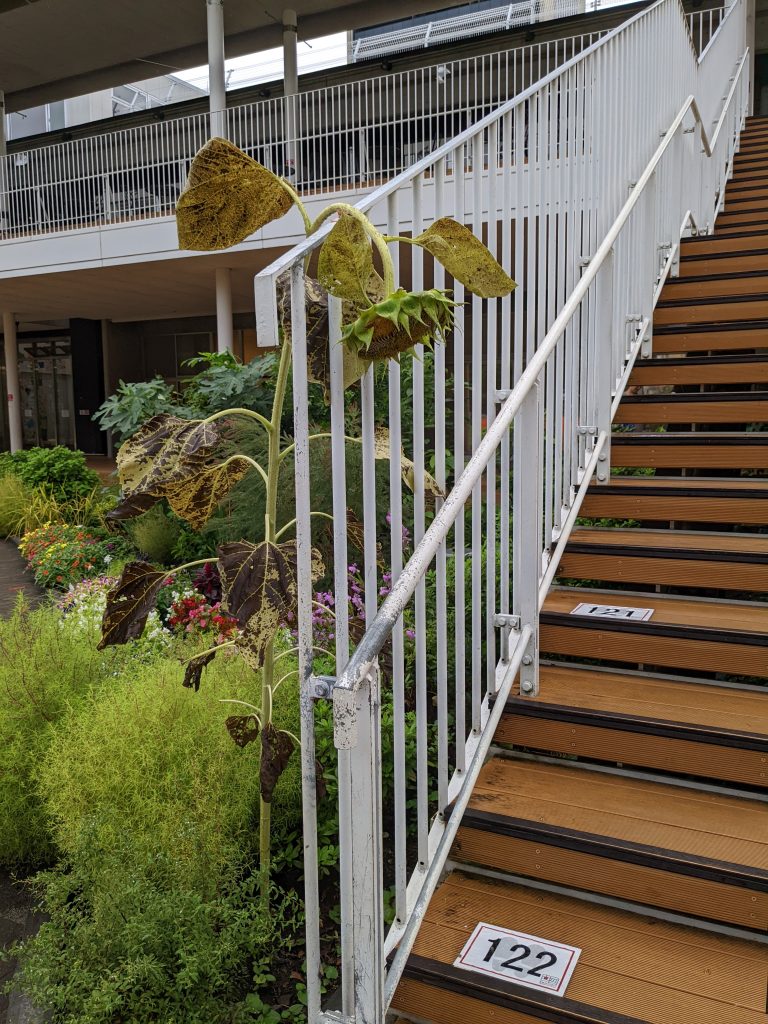4問目の指定場所の立川まんがぱーくで見つけた向日葵。完全に頭が垂れていて夏の終わりを感じます、、、。